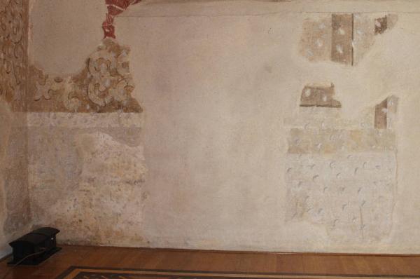 - NOTIZIE STORICO CRITICHE La decorazione pittorica che interessa la parete settentrionale, quella occidentale e quella meridionale della Sala degli Affreschi è venuta alla luce tra marzo 2001 e luglio 2002 quando, durante i lavori di sostituzione della vecchia tapezzeria che ricopriva le pareti della stanza, vennero trovate tracce di affreschi sempre più estese. Tolta interamente la tappezzeria, le pareti mostrarono ampie superfici dipinte pertineti a due campagne decorative diverse. La prima databile al XIV secolo, la seconda al XVII.
