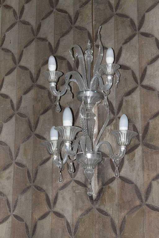 Lampadario a muro costituito da un doppio ordine sovrapposto di bracci raccordati da un sostegno centrale a balaustro. I bracci sono arricchiti da anelli che sostengono pendagli a goccia, le bobèches sono a coppa espansa e foglie affusolate dalla punta ritorta completano l'insieme.