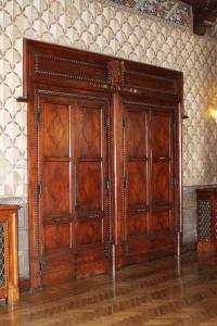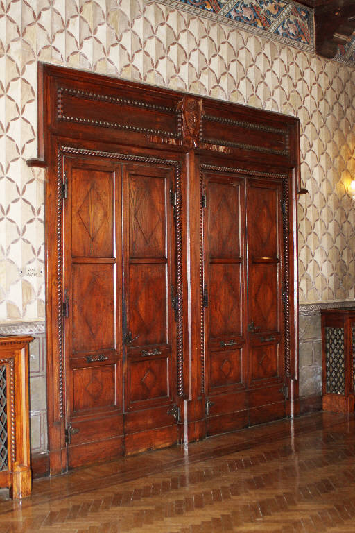 Porta doppia con profilo decorato da un elemento a torciglione sul quale si innestano le cerniere dei battenti in ferro battuto decorato. Coronamento superiore caratterizzato dallo stemma comunale di Brescia realizzato a rilievo a fianco del quale si sviluppano due specchiature quadrangolari definite da un bordo a dentelli rilevato. I battenti delle porte presentano tre specchiature con un rombo centrale a rilievo e maniglie in ferro battuto decorate.