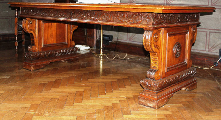 Tavolo caratterizzato da una ricca decorazione a rilievo: il piano di appoggio quadrangolare è completato da una alta cornice con girali vegetali che, a sua volta, appoggia su due ampi sostegni che inglobano i piedi del tavolo e sono decorati, ai lati, da due ampie volute, mentre nella parte centrale presentano una specchiatura con, al centro una rosetta a rilievo; il profilo inferiore è decorato da elementi vegetali stilizzati.