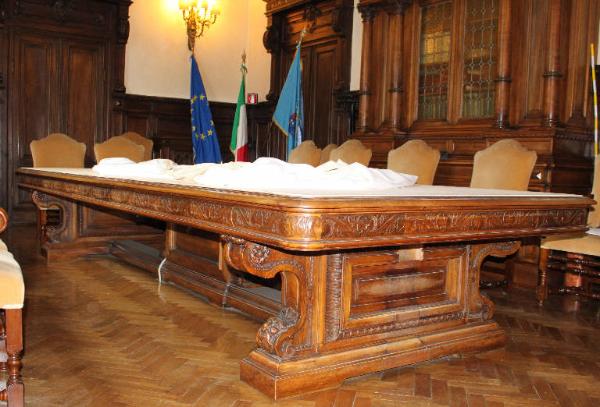 Imponente tavolo con alto piano d'appoggio che contiene dei cassettini perfettamente mimetizzati nel profilo del tavolo che è decorato a rilievo da motivi decorativi a girali vegetali stilizzati. Le basi del tavolo sono costituite da due elementi quadrangolari che, ai lati, presentano volute decorate a rilievo con foglie e fiori ai lati e sulla fronte hanno una specchiatura quadrangolare con cornice modanata e decorata con morivi fitomorfi stilizzati.