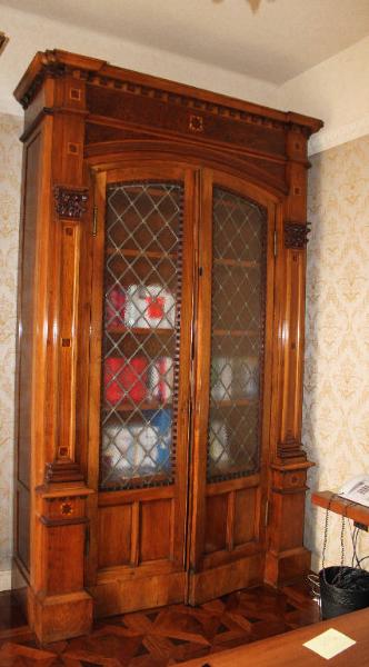 Grande armadio libreria con una fisionomia spiccatamente architettonica: il prospetto del mobile, nel quale sono inseriti piccoli intarsi a motivi geometrici, è caratterizzato da due alte basi a dado che sostegono due paraste con capitelli corinzi scolpiti a rilievo sulle quali si imposta il coronamento superiore architravato e decorato da una cornice a dentelli. La libreria è chiusa a due sportelli con vetri piombati inseriti in una cornice lignea con il profilo superiore stondato e quello inferiore decorato da grandi specchiature quadrangolari.