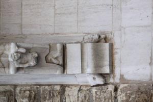 Mensolone trapezoidale con inserti decorativi a rilievo nella parte inferiore e sulla fronte.