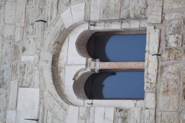 Bifora con ghiera a tutto sesto, colonnina a fusto liscio senza base e capitello a fogle d'acqua che imposta due archetti sesto acuto lievemente accennato