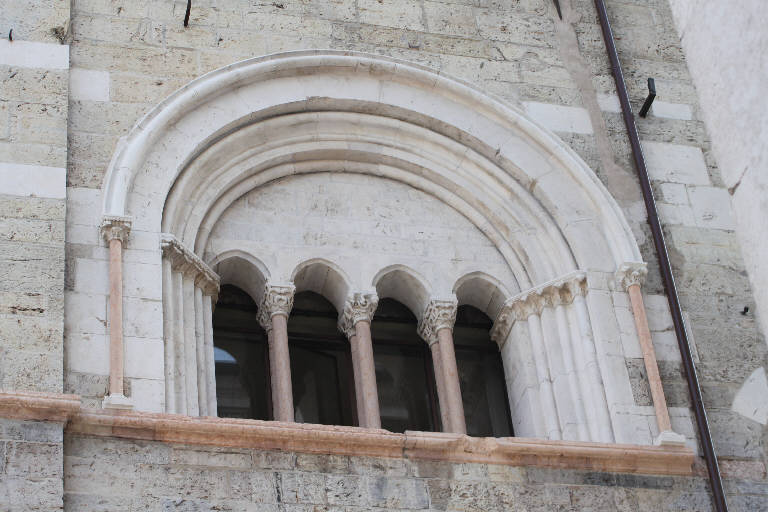 Quadrifora a tutto sesto con strombatura a fasci semicilindrici e quadrangolari con rilievo in corrispondenza dei capitelli e mensolone aggenntante. La ghiera esterna poggia su due semicolonne con base e capitello a rilievo. Colonnine binate con doppi capitelli troncoconoidali figurati che sostengono archetti a sesto acuto.