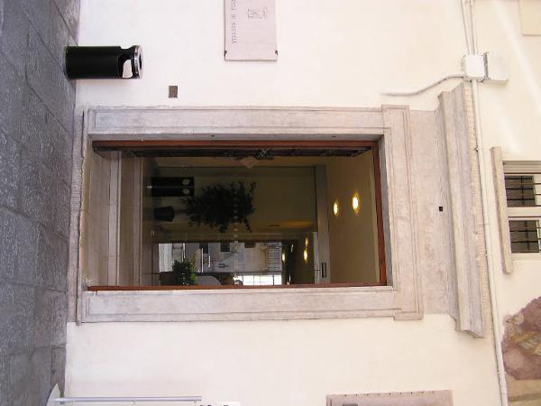 Mostra rettangolare trabeata con stipiti e architrave lisci specchiati, fregi liscio e cornice con mensolone aggettante.