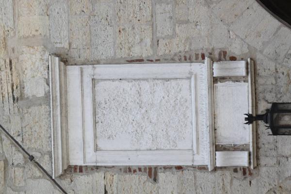 Lastra rettangolare incorniciata da edicola aggettante con cornice modanata e trabeata, mensolone centrale aggettante con cartella centrale e peducci a volute ai lati.