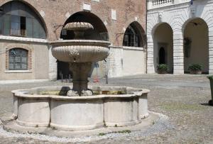 Fontana costituita da vasca polilobata e doccione a fusto centrale, con base circolare, fusto a volute e catino superiore a conca con terminazione a cupola.