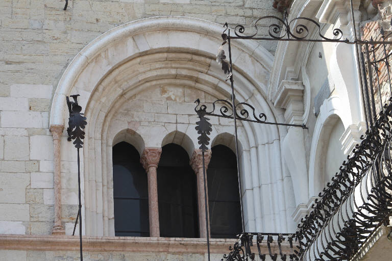 Mostra con ghiera a tutto sesto strombata, con colonnine che sostengono l'estradosso esterno costolonato; due colonnine binate con capitelli decorati a bassorilievo sostengono archetti ad arco a mandorla.