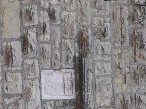 Cartella rettangolare con bordo modanato e stemma centrale abraso con cornice superiore decorata a rilievo da motivi gigliati.