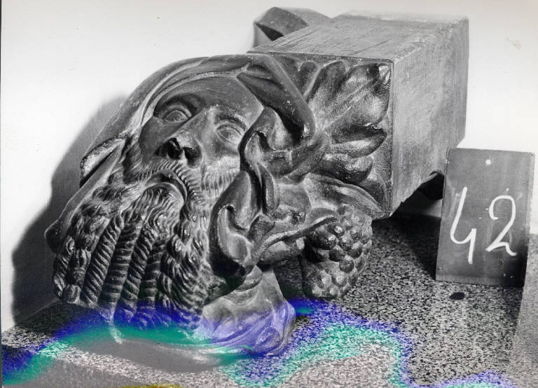 Testa d'uomo con lunga e prolissa barba; il capo è coperto da una stoffa (cappuccio?) che ricade ai lati del viso, da un lato in morbide pieghe. Sullo stesso lato è un piccolo grappolo d'uva che sporge dalla decorazione a fogliame con la quale si conclude in alto il peduccio.
