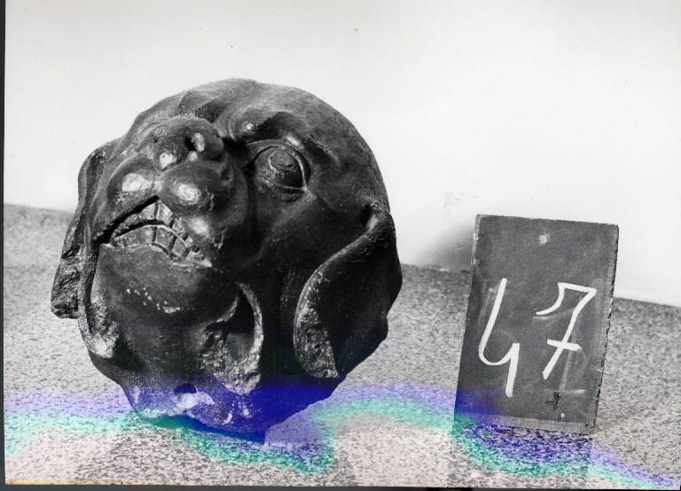 Peduccio raffigurante la testa di un cane mastino con orecchie pendenti e bocca socchiusa a denti stretti. Le pupille sono in piombo.