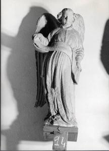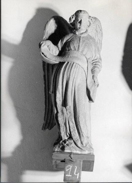 l'angelo ha una lunga veste con maniche , cinta in vita, che lascia scoperti i piedi nudi; dietro alla figura le ali dalle piume ben definite, giungono fino circa alle ginocchia, l'angelo tiene aperto fra le mani un cartiglio. sul retro: la statua non ha alcuna definizione formale, ma è quasi piatta e la superficie presenta i segni della sbozzatura; al centro del busto è inserito, in un piccolo alloggiamento, il gancio d'ancoraggio, al quale è ancora fissata la catena ( 3 anelli); il gancio è saldato al marmo con piombo; gancio e catena sono in ferro
