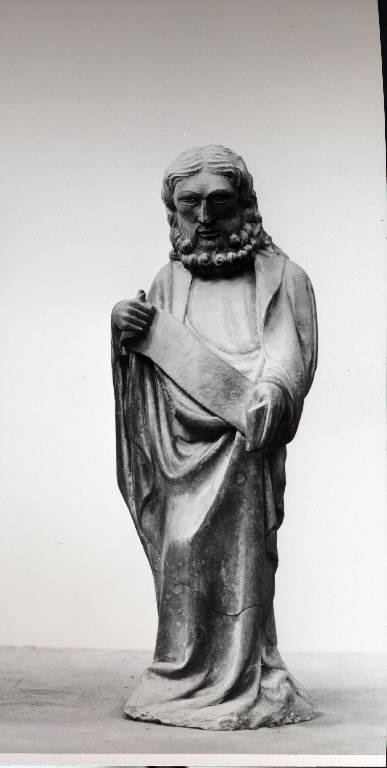 Figura maschile con lunghi capelli e barba corta che gli incornicia il volto. Indossa una lunga veste che lo ricopre interamente fino ai piedi che non sono visibili. Il santo è rappresentato con il capo aggettante e leggermente rivolto verso destra. Tra le mani stringe un cartiglio privo di iscrizioni. Il peso del corpo poggia sulla gamba destra, leggermente flessa in avanti e in posizione arretrata rispetto alla sinistra. Sul retro pur non essendo definita la soluzione formale, la superficie non è levigata ma presenta i segni dello scalpello e/o della gradina tenuta ad angolo ampio rispetto ad essa.\nAl centro del busto d'ancoraggio in ferro, a sezione quadrata, al quale manca l'anello terminale.