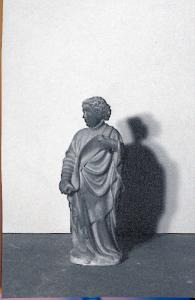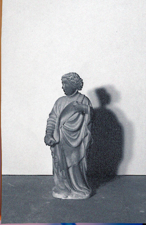 Figura maschile sbarbata con capelli corti e ricci. Abbigliato con una veste lunga fino ai piedi e con il collo alto chiuso da due bottoni. la testa è girata verso destra. tra le mani sorregge un cartiglio srotolato.\nSul retro: è completamente definita la soluzione formale, ma al centro la superficie non è del tutto levigata.\nAl centro del busto è inserito, in un piccolo alloggiamento, saldato al marmo con piombo, il gancio d'ancoraggio in ferro, a sezione quadrata, al quale manca l'anello terminale