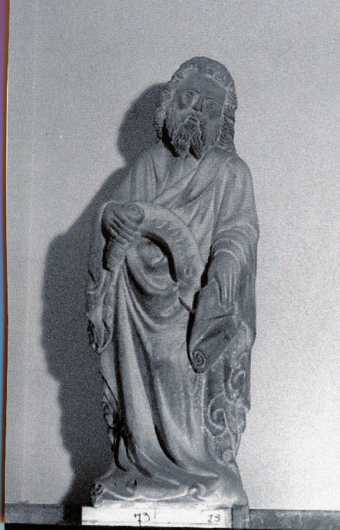 - NOTIZIE STORICO CRITICHE Statuetta proveniente dal pilone n 88 e discesa per la mostra Arte Lombarda dai Visconti agli Sforza nel 1958, in occasione di questo evento il Russoli la attribuisce alla scuola renana, mettendola \nAnche il Mele nel 1960 la elenca tra le sculture di scuola Renana. Attribuita dalla Bossaglia alla stessa mano che fece le statuette Cin. 58 e Cin 59, assegnandole con dubbio all'ambito francese e datandole a cavallo tra il XIV e il XV secolo. Innegabile è la stessa matrice di bottega riguardo a questa cerchia di tre opere. \nSono collocate nella seconda metà del 1400 dalla studiosa Elisabetta Bianchi nel suo contributo uscito nel 2003 su Prospettiva. La Bianchi avanza un'attribuzione a Cristoforo Luvoni sulla base di confronti stilistici con la sua unica opera certa: il monumento funebre Birago, conservato nel transetto della chiesa di San Marco a Milano, eseguito nel 1455. Inoltre in un suo successivo saggio pubblicato nel 2005 su Proporzioni cerca di ricostruire, sempre su basi stilistiche, una sorta di catalogo di opere ascrivibili al Luvoni, chiamando in causa una serie di statuette (che lei asserisce essere conservate in Museo e in Arcivescovado, sono invece, tutte tranne 2 fig. 53, fig. 54, fig., ritornate sui piloni) che a volte paiono assomigliare a questa stessa bottega del Maestro delle statuette E, a volte appaiono di diversa mano. In questo elenco, sono identificabili tra diverse mani, due influenze artistiche: la matrice stilistica proveniente dalle maestranze comacine presenti in Fabbrica nei primi anni del 1400 e quella di Jacopino. La tipologia di stilemi fisiognomici e grafici come la resa dei capelli e della barba estremamente distintiva, la bocca piccola e carnosa, si può ritrovare per esempio in una scultura risalente alla metà del XIV secolo presso la chiesa di Sant'Antonio Abate di Cantù (vedi Zagstrow, 1989, pp. 41-42). I maestri comacini, giunti a Milano attirati dal grande cantiere, si sono evoluti rispetto ai loro conterranei, per il contatto con la scultura Jacopinesca, soprattutto riguardo alla resa morbida dei panneggi, ricchi di riccioli e anse. A dimostrazione del fatto che la capigliatura così scavata e avviluppata, sia uno stilema che si sviluppò nella scultura dell'epoca, basti guardare gli apostoli dei Maestri Campionesi, provenienti da Santa Maria Maggiore, ora conservati in Duomo. Le attribuzioni della Bianchi sono dettate dall'individuazione di alcuni stilemi della scultura del Luvoni che, avendo avuto contatto diretto con la Fabbrica, sembra avere assorbito, tra cui le caratteristiche Jacopinesche. Essendo Jacopino filofrancesce si giustifica dunque la prudente attribuzione della Bossaglia all'ambito della scuola francese. La convivenza di diverse matrici stilistiche in queste opere del maestro delle statuette E è sintomatico dell'ambiente culturale in cui nascono: dagli albori di un cantiere internazionale, dove convivevano strettamente artisti provenienti da diverse località e che dovevano lavorare su modelli disegnati come per esempio quelli di Giovannino de Grassi. L'impostazione fisiognomica individuata dalla Bianchi negli angeli reggicero del monumento Birago e direttamente confrontata con le statuette, che sembrano somigliare alle caratteristiche di questo ambito sono imputabili per la caratterizzazione dei volti alla provenienza del Luvoni, cioè da Seregno, in prossimità del territorio in cui operarono i maestri comacini e dal suo contatto con gli stessi presso la Fabbrica. In particolare alla mano del maestro delle statuette Queste contestualizzazioni sono dedotte dal clima culturale presente in Fabbrica nella prima metà del 1400, che cambia rotta decisamente già verso la metà del secolo, con l'arrivo dell'Amadeo. E' quindi difficile far risalire la datazione di queste statuette nella seconda metà del 1400. E' più plausibile che, le somiglianze riscontrate dalla Bianchi, siano da rivedere in senso opposto: fu il Luvoni ad assorbire questi particolari stilemi e a riproporli nel monumento funebre Birago, datato 1445. Si propone dunque,per queste statuette una datazione che rientra abbondantemente nella prima metà del XV secolo. La questione rimarrà comunque sempre aperta fino a che non verranno rinvenuti documenti che possano dipanare in modo inconfutabilmente la questione.