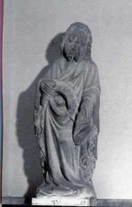La statuetta rappresenta un uomo con capelli e barba lunga bipartita. Lo sguardo è rivolto verso il basso e il volto leggermente ruotato verso sx rispetto al busto. La figura è ammantata fino ai piedi. Le mani, scoperte e allungate, sostengono un cartiglio srotolato con iscritto a caratteri gotici IONAS. Il ginocchio sx è leggermente piegato e dando forma al panneggio della veste. I panneggi delle maniche sono caratterizzati da pieghe arrotondate e strette.\nsul retro: pur essendo già definita la soluzione formale, anche se non plausibile anatomicamente, la superficie non è levigata ma presenta i segni dello scalpello e/o della gradina tenuta ad angolo ampio rispetto ad essa (solchi brevi quasi incisioni a punta ma a distanza fissa)