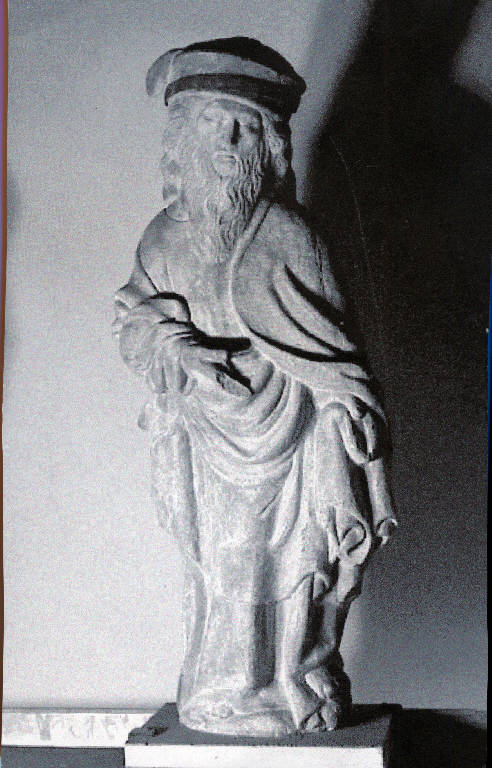 Profeta paludato, in testa porta un berretto, ha capelli che arrivano sotto le spalle e una folta barba che scendo verso il petto a forma di V. Il viso è leggermente reclinato verso il basso e verso il lato sx. Il Braccio dx corre quasi parallelo lungo il busto, la mano scoperta dalla veste con il palmo rivolto verso l'alto si presenta danneggiata in corrispondenza delle dita. Il braccio sx corre lungo il fianco termina con la mano che sorregge la veste, ne risulta visibile solo il pollice. Dalla lunga veste fuoriescono le dita dei piedi, nudi.\nSul retro: pur essendo già definita la soluzione formale, la superficie non è levigata ma presenta i segni dello scalpello e/o della gradina tenuta ad angolo ampio rispetto ad essa (solchi brevi quasi incisioni a punta ma a distanza fissa). Al centro del busto è inserito, in un piccolo alloggiamento, il gancio d'ancoraggio.