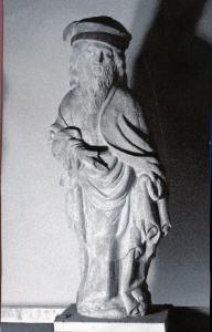 - NOTIZIE STORICO CRITICHE A causa della scarsità di documentazione e della quantità di scalpellini che lavoravano in quegli anni presso il cantiere, risulta pressoché impossibile attribuire l'opera. Stlisticamente contiene diversi richiami alla scultura francese per quanto riguarda la dolcezza dell'espressione e renana nella resa dei lineamenti e dei panneggi. Il Russoli nel 1958 la ascrive alla scultura borgognona come il Mele nel 1960.\nE' la Bossaglia, nel 1973 e 78, ad aggiungere alle note caratteristiche dell'arte borgognona i tratti di una contaminazione renana confrontandolo con la statuaria maggiore di sicura provenienza teutonica. Raggruppa in un'unica famiglia questa statuetta con altre due cin. 61 e cin. 62, denominandola del Maestro delle statuette F. Queste statuette non sono state modellate dalla stessa mano ma bensì dalla medesima bottega che ne possedeva i modelli, da confrontare la resa della barba della cin. 60 e cin. 61 che scende a punta. I modelli disegnato dallo stesso artista crea forti similitudini tra mani diverse.\nE' assai plausibile che ci fosse una contaminazione di stilemi di diverse nazionalità dovuta alla promiscuità lavorativa nella quale si trovavano i primi maestri del grande cantiere. Il frutto di questa stretta convivenza in un luogo internazionale, diede vita a meravigliose fusioni di diversi ambiti artistici.\nDa notare il particolare delle dita dei piedi che escono dalla veste riscontrabili sia nella scultura borgognona della guglia Carelli (cfr. cin. 24-25-26-28) sia nella scultura renana (cfr cin.35-36-37-38). \nIl copricapo potrebbe ridurre l'arco cronologico di datazione della statuetta agli anni Novanta del Trecento in quanto si ritrova nelle rappresentazioni miniate del XIV secolo (cfr: R.L. Pisetzky, Storia del Costume in Italia, Milano, 1964, ill. n 1 Miniatura di una matricola dell'arte dei notai di Perugia del secolo XIV, Fondazione Cini, Venezia).\nProveniente dal pilone 53.