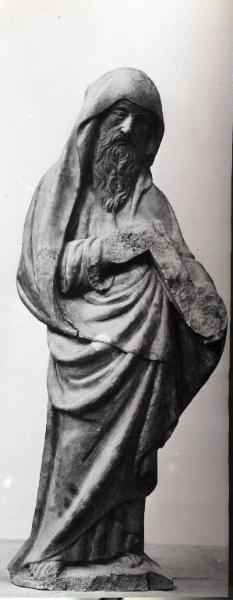 Uomo paludato, velato, con barba che scende verso il petto a V. Tra le mani sosteneva qualcosa, forse un cartiglio, non più visibile in quanto danneggiato. Il danno ha coinvolto completamente la mano dx e parzialmente la mano sx di cui rimangono solo il migonolo e l'anulare.Dalla lunga veste spuntano le dita dei piedi, nudi.\nSul retro: pur essendo già definita la soluzione formale, la superficie non è levigata ma presenta i segni dello scalpello e/o della gradina tenuta ad angolo ampio rispetto ad essa (solchi brevi quasi incisioni a punta ma a distanza fissa). Al centro del busto è inserito, in un piccolo alloggiamento, il gancio d'ancoraggio.