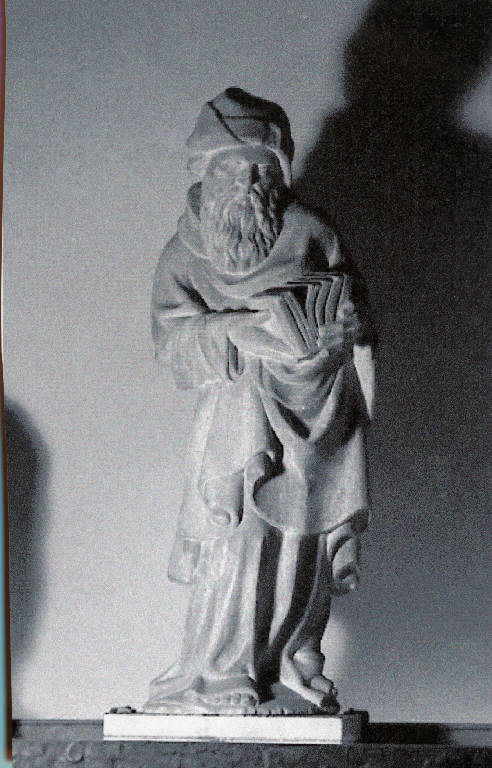 Uomo con in capo un berretto, i capelli spuntano dai lato del berretto, la barba di forma rotondeggiante si allunga fino al petto. Il capo è reclinato, lo sguardo rivolto verso il libro che tiene tra le mani. Il libro è semiaperto e lo sfoglia con le dita. La forma della statuetta presenta un accennato movimento a S. Dalla veste escono le dita dei piedi, nudi.\nsul retro: pur essendo già definita la soluzione formale, la superficie non è levigata ma presenta i segni dello scalpello e/o della gradina tenuta ad angolo ampio rispetto ad essa (solchi brevi quasi incisioni a punta ma a distanza fissa). Al centro del busto è inserito, in un piccolo alloggiamento, il gancio d'ancoraggio in ferro.