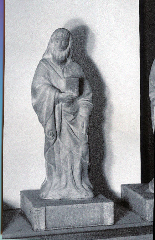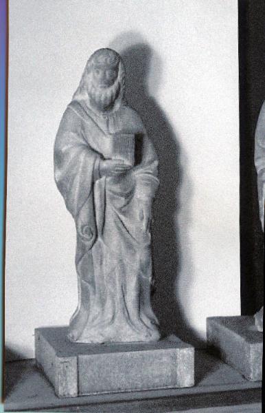 La statuetta si presenta nelle sembianze di un uomo con capelli e barba lunghi. La barba sembra appena sbozzata a differenza dei capelli che appaiono rifiniti. La testa è ruotata leggermente verso dx rispetto al corpo. Nella mano dx sostiene un libro chiuso del quale sono visibile le pagine incise a la chiusura del libro. Il braccio sx corre lungo il fianco. La veste lunga copre i piedi.\nSul retro: nella parte centrale, dal capo alla base, non vi è soluzione formale, ma la superficie quasi piatta, presenta i segni della punta usata per la sbozzatura.