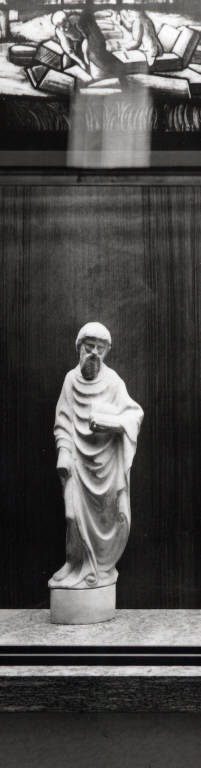 Uomo barbuto. La barba e i capelli presentano una particolare lavorazione a martellinature.\nIl capo è leggermente reclinato verso sx. Nella mano sx sostiene un libro aperto che non presenta iscrizioni. Il braccio dx corre lungo il fianco e la mano con il pugno chiuso pare sostenere un lembo della veste. La veste, lavorata a panneggi morbidi e curvilinei è lunga fino a piedi ma lascia scoperto completamente il piede dx e la puta delle dita del piede sx.\nsul retro: nella parte centrale, dal capo alla base, non vi è soluzione formale, ma la superficie quasi piatta, presenta i segni della punta usata per la sbozzatura