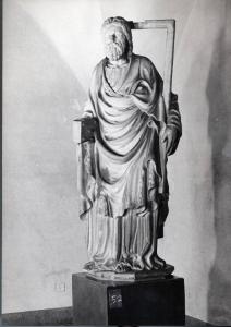 Figura maschile con barba e capelli ondulati. la veste lunga, con una copriveste apposta, lascia intravedere la punta dei piedi che indossano calzari aperti. nella mano destra sostiene un libro chiuso, con la mano sinistra regge il bastone.\nSul retro: l'opera si presenta finita e al centro del busto vi è un grosso incavo nel quale sono scavati tre alloggiamenti disposti verticalmente: i due superiori sono vuoti , mentre nel terzo è inserito il gancio d'ancoraggio