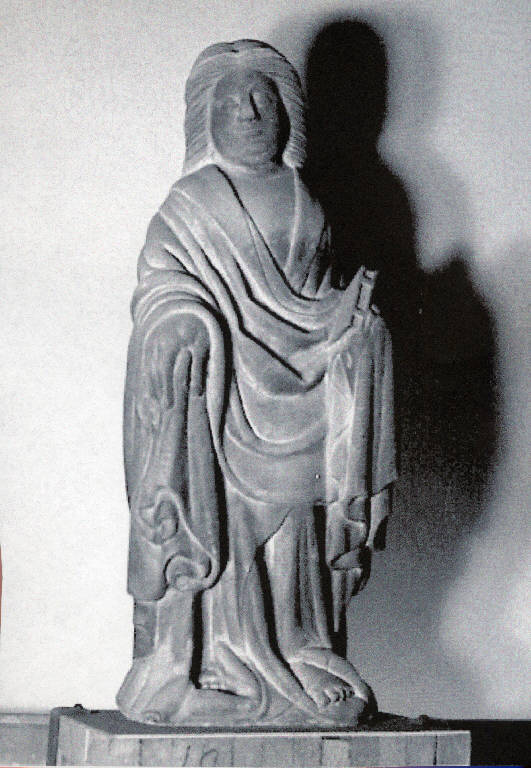 Figura femminile? pauldata. Con la mano sinistra coperta dalla veste sostiene un libro chiuso. Con la mano destra stringe un lembo della veste.\nsul retro: l'opera si presenta finita \nAl centro del busto è inserito, in un piccolo alloggiamento, saldato al marmo con piombo, il gancio d'ancoraggio in ferro, a sezione quadrata, al quale manca l'anella terminale