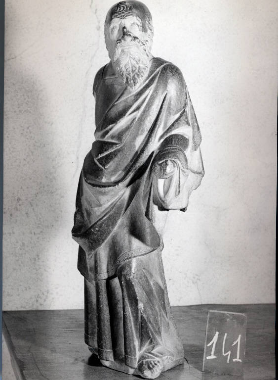 - NOTIZIE STORICO CRITICHE Eccentrico, più volte paragonato ad una bonzo cinese, questa statuetta, la cui identificazione oscilla tra l'Apostolo e il Profeta, non trova facili riscontri nelle scultura in Duomo. Si preferisce in questa sede la denominazione di Apostolo, seppure con alcune perplessità. La bella mano destra, sopravvissuta alla caduta del braccio, perché connessa al fianco, non è nella posizione tale da reggere alcun cartiglio, né vi sono tracce di esso nella parte sinistra della statua, di cui forse si sono persi gli attributi agiografici. Per la posa e la caratteristica stempiatura si potrebbe pensare in via ipotetica ad un san Paolo.\nIn considerazione della particolarità della statua sono del tutto singolari i dettagli fisiognomici e il panneggio dalle pieghe ampie, ma rigide. Anche il confronto con la scultura posta a decorazione dei piloni vicini non porta ad avvicinare la statua a nessuna mano particolare, o gruppi identificati. Rimane aperto inoltre, sino ad ora, il nodo della datazione. Se per Costantino Baroni, una data vicino al 1405, poteva essere possibile, per i confronti con l'attività di maestri tedeschi quale il Fernach, Rossana Bossaglia vede nella minuzia del dettaglio grafico, una carattere più compatibile la seconda metà del secolo. Pur nella convinzione che si tratti di una statua con caratteristiche tutt'altro che comuni, si propone di mantenere una datazione entro la metà del secolo, in considerazione della cronologia delle altre statue dei piloni attigui a quello di provenienza del nostro.