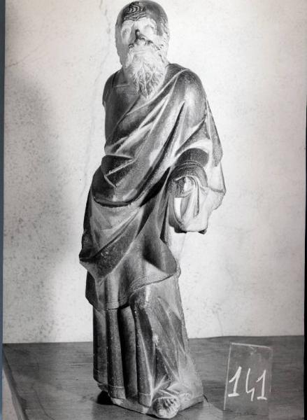 figura maschile con barba descritta con ricercatezza in eleganti andamenti di ciocche,che parte dalle lunghe basette, fronte solcata da profonde rughe disposte trasversalmente e longitudinalmente al viso, naso dal profilo schiacciato, capo completamente calvo eccetto ciuffo di capelli alla sommità, verso la fronte. Indossa una lunga veste tunicata con manto ricadente dalla spalla sx, sul braccio sx, ed avvolgente il fianco dx. Il piede sx, non calzato, sporge dalla tunica. Il manto presenta un bordo lavorato come lo scollo quadrato della tunica. La posizione del corpo è determinata dall'appoggio sulla gamba destra, mentre la gamba e il braccio sinistro sono piegati, determinando il movimento della figura.Manca il braccio destro, mentre rimane la mano rivolta verso il palmo, appoggiata alla tunica, e la mano sinistra. La statua non è finita posteriormente, ma la superficie non levigata presenta i segni dello scalpello