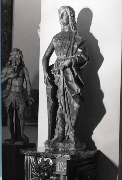 Figura giovanile con capelli lunghi fluenti, indossa una lunga veste con scollo quadrato. la mano destra sostiene uno scudo con stemmi viscontei e sforzeschi. La mano sinistra è appiggiata in vita, il pollice infilato nella cintura. Sul retro: l'opera si presenta finita.
