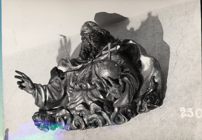 Figura maschile con capelli e barba lunga rappresentato a mezzo busto, poggiantew su nuvola figurata con teste di cherubini. la mano destra è alzata in segno di benedizione, la mano sinistra sostiene il globo sormontato da una croce. indossa una veste e un mantello.