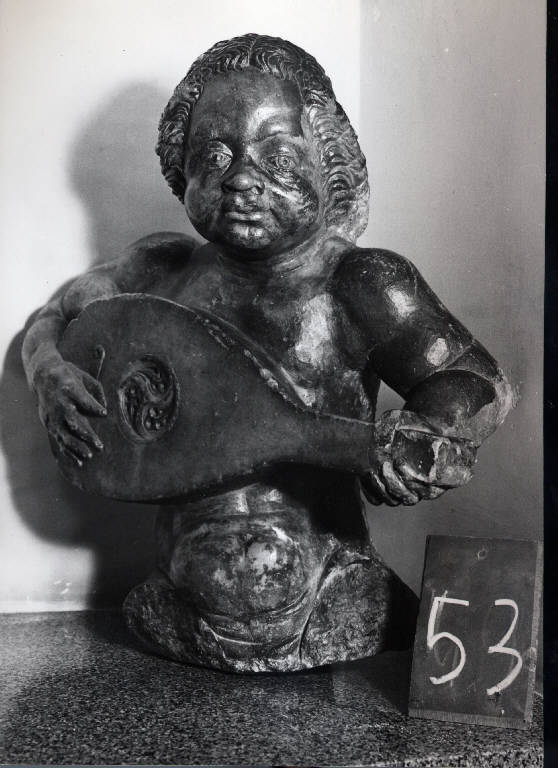 Figura di suonatore di liuto, con accentuati tratti somatici: il naso vagamente camuso, la bocca carnosa, e gli occhi spioventi, particolarmente segnati, quasi a negare, la tradizionale figura di putto suonatore. La capigliatura, resa in modo compatto e movimentata da fitte incisioni ondulate, e portata all'indietro e in lunghezza arriva a toccare le spalle. La figuretta è intenta a suonare un liuto, la cui cassa armonica è decorata con un traforo tripartito. Le parti anatomiche visibili, rivelano una corporatura massiccia e tornita.\nSul retro, pur essendo già definita la soluzione formale, la superficie presenta i segni della punta al centro del busto è inserito, in un piccolo alloggiamento, il gancio d'ancoraggio in ferro saldato al marmo con piombo usata per l'abbozzatura.