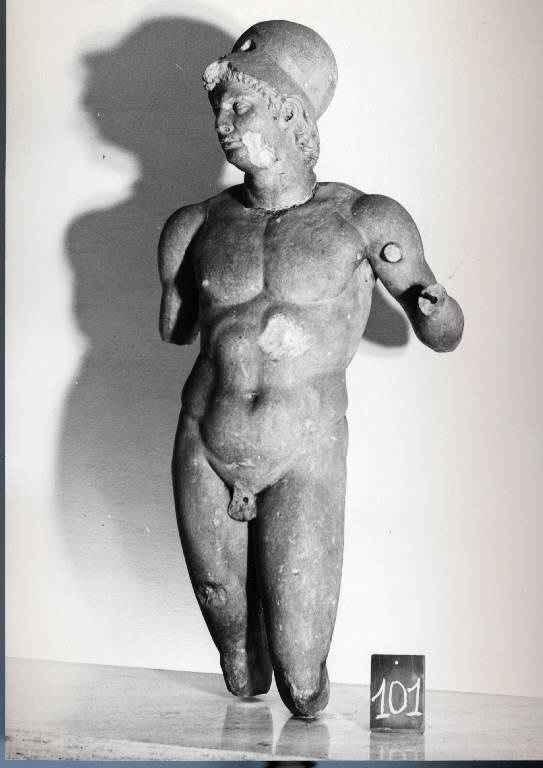 Figura maschile nuda con elmo in testa. Mutila di gambe e braccia.