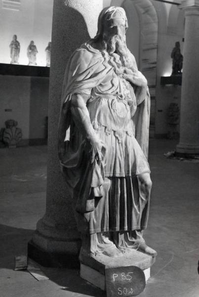 Figura maschile stante, velata, con barba lunga. abbigliato con ricche vesti ed un mantello che gli copre le spalle e parte delle braccia. con la mano sinistra si tocca la lunga barba, con la destra sostiene un lembo della veste.\nsul retro: pur essendo già definita la soluzione formale, la superficie non è levigata ma presenta i segni della punta