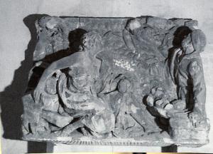 rilievo in marmo rappresentante il Sacrificio d'Elia. Sulla sinistra della scena c'è una figura femminile seminuda seduta, appoggiata ad un tronco d'albero. di fonte a Lei una fugura maschile a mezzobusto tra le fiamme indossa un copricapo e rappresentanto nell'atto di guardare in alto verso una figura angelica.