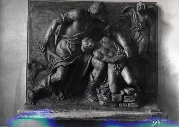 rilievo in terracotta rappresentante il sacrificio d'Isacco. Sulla sinistra della scena c'è la figura maschile di Abramo che sostiene un pugnale con la mano destra ed con la sinistra tiene fermo Isacco.\nIsacco figura di giovane uomo è inginocchiato su un focolare con la testa riversa sulla coscia sinistra di Abramo. sulla destra del rilievo un angelo ferma la mano di Abramo.