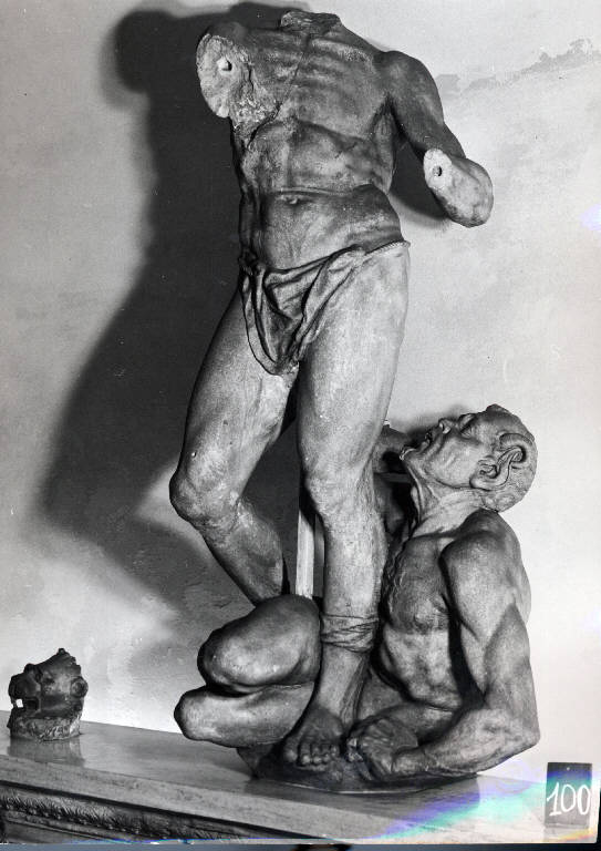 figura maschile stante seminuda, mutila delle braccia e della testa, ai suoi piedi una figura demoniaca antropomorfa.