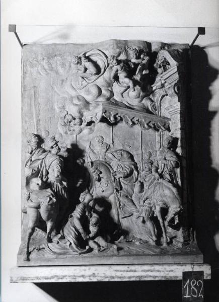 - NOTIZIE STORICO CRITICHE Modello per il rilievo della cappella di S Giovanni Bono rappresentante l'entrata del Santo a Milano. Eseguito dal Bussola.\nSi vedano gli studi pubblicati da Francesca Bianchi Janetti.