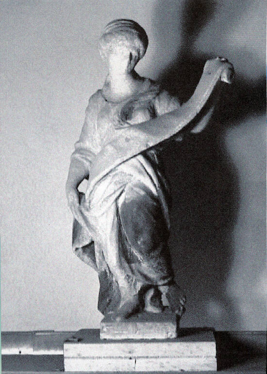 Figura femminile stante con capelli raccolti. Inodssa una lunga veste che le lascia i piedi scoperti. Sostiene un cartiglio tra le mani. sul retro l'opera si presenta finita e al centro del busto è inserito, in un piccolo alloggiamento, il gancio d'ancoraggio
