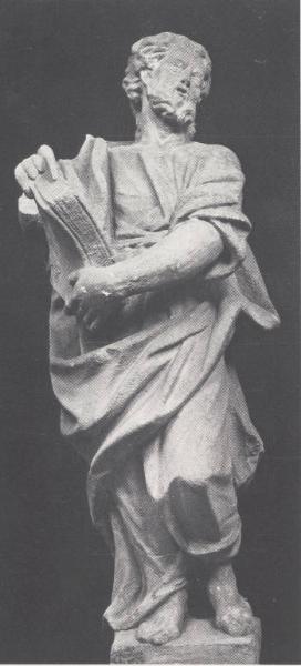 Figura maschile stante, barbuta. Inodda lunghe vesti. i piedi sono scalzi. Tra le mani sostiene un libro chiuso.\nsul retro l'opera si presenta finita e al centro del busto è inserito, in un piccolo alloggiamento, il gancio d'ancoraggio