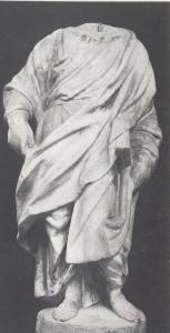 Figura maschile stante acefala. Inoddsa lunghe vesti. Ai piedi porta calzari aperti. Con la mano sinistra sostiene un libro chiuso .