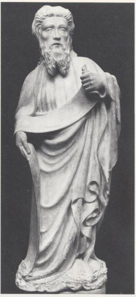 Figura maschile stante barbuta. indossa una lunga veste che gli copre i piedi. tra le mani sostiene un cartiglio srotolato privo d'sicrizioni.