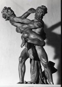 Figure virili in lotta, un uomo barbuto solleva pe la vita una seconda figura che si divincola nella stretta.