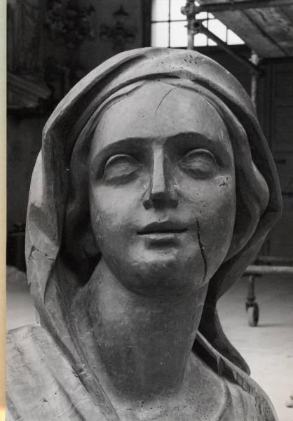Busto della verrgine, il volto è rivoltosinistra, la bocca livemente socchiusa e sordente.