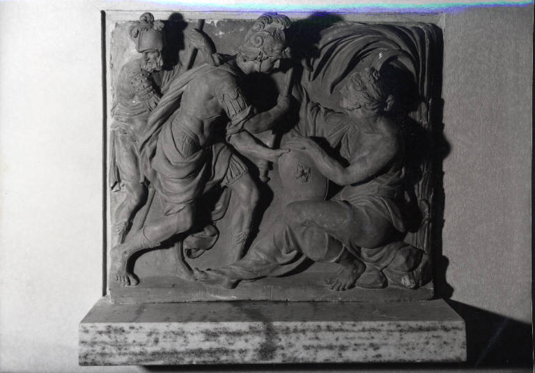 Bassorilievo con tre figure: una donna anziana è seduta sontto una palama, due uomini dennal parte sinistra le sono davanti in armi, appoggiati ad una lancia.