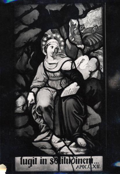 La scena è tratta dall'Apocalisse di S. Giovanni dal capitolo XII, e rappresenta l' apparizione della Vergine con un aureola stellata e raggiante di luce, mentre regge tra la mani il "libro della Rivelazione" e mettendo in fuga il demonio ettacefalo.\nLa Vergine appare al centro del pannello, indossa un lungo abito con morbide pieghe a due strati con una fascia che lo tiene bloccato sotto il seno. Porta anche un lungo foulard al collo che funge anche da velo in testa; velo che però lascia vedere i capelli ondulati e bruni sottostanti, forse scostato dal vento.\nLa Vergine è seduta sopra una roccia e con la mano destra indica con il dito indice la terra, mentre con la mano sinistra regge il libro appoggiandolo sulla gamba. Il viso è inclinato verso sinistra e gli occhi guadano il cielo. \nIl drago ha sette teste, di cui però se ne vedono solo tre, è alato ed è posizionato nell' estremità a sinistra in alto del pannello. \nIn basso, a quest' ultimo, è stato inserito un cartiglio con la frase, che da anche il titolo all'opera, tratta appunto dall' apocalisse