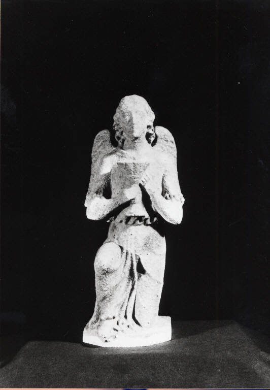 Angelo inginocchiato con calice in mano, la gamba destra avanzata a coperta dalla lunga tunica.