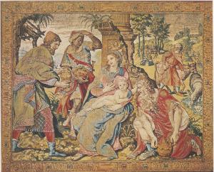 L'adorazione è ambientata davanti a una colonna classica sbreccata, dietroa alla quale si apre una paesaggoi campestre, sue dei magi, sono alla destra del riguradante, mentre il terzo è inginocchiato davanti al Bambino.